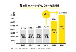 具体的な数字を見ていくと、2019年には4000億円規模だった国内のデリバリー市場は、2021年には約2倍の8000億円まで一気に膨らみました。2022年内に1兆円の大台を突破する見込みですが、そこからは市場の拡大スピードが減速するというのが、大方の予測です。