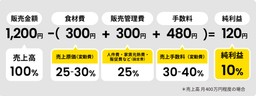 利益率10%という数字が、ひとつの目標になるはずです。この数字の根拠を、もう少し具体的に説明してみましょう。まずは一般的に食材費が、売上高の25〜30%かかります。さらに人件費や家賃光熱費・販促費などが25%。そしてデリバリーの場合は、プラットフォームへの手数料が30〜40%かかります。これを販売金額1,200円の商品に当てはめたのが、下記の図表です。